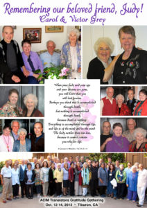 Judy, The gift of your friendship was (and continues to be ) a blessing in our lives. I remember as if it were yesterday that first telephone call from you asking if I’d be interested in working on an Archival website for the Foundation for Inner Peace. Victor and I had been students of the Course for over 8 years when I got that phone call! I actually started to cry happy tears and by the next week Victor and I were sitting in your living room with you and Whit discussing the first steps of what turned out to be a journey of love between the four of us. We worked on so many amazing projects together: Redesigning the ACIM.org website, Designing the original ACIM-Archives.org website, Designing Whit’s Memorial site, the many ACIM holiday cards we designed together, Designing and publishing your Sweet Treats Family Cookbook, the over 400 ACIM Weekly Thoughts that started as a conversation and blossomed into over 20,000 subscribers, the amazing ACIM Translators Gratitude Gathering, the many dinners we shared. All of this and more keeps you alive in our hearts. I know that you are now with your beloved Whit and the two of you are guiding us as we continue to do our earthly work. “Love is the way I walk in gratitude!” Thank you, beloved Judy!